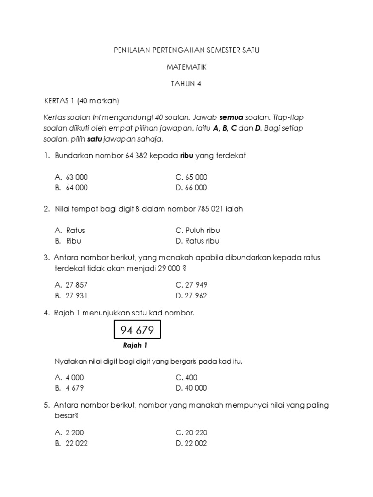 1 Bulatkan Jawapan Yang Betul 1 Empat Ribu Tiga Ratus Lima Dalam Angka Ialah A 4 305 C 4 350 B 4 315 D Mathematics Worksheets Education Kids Education