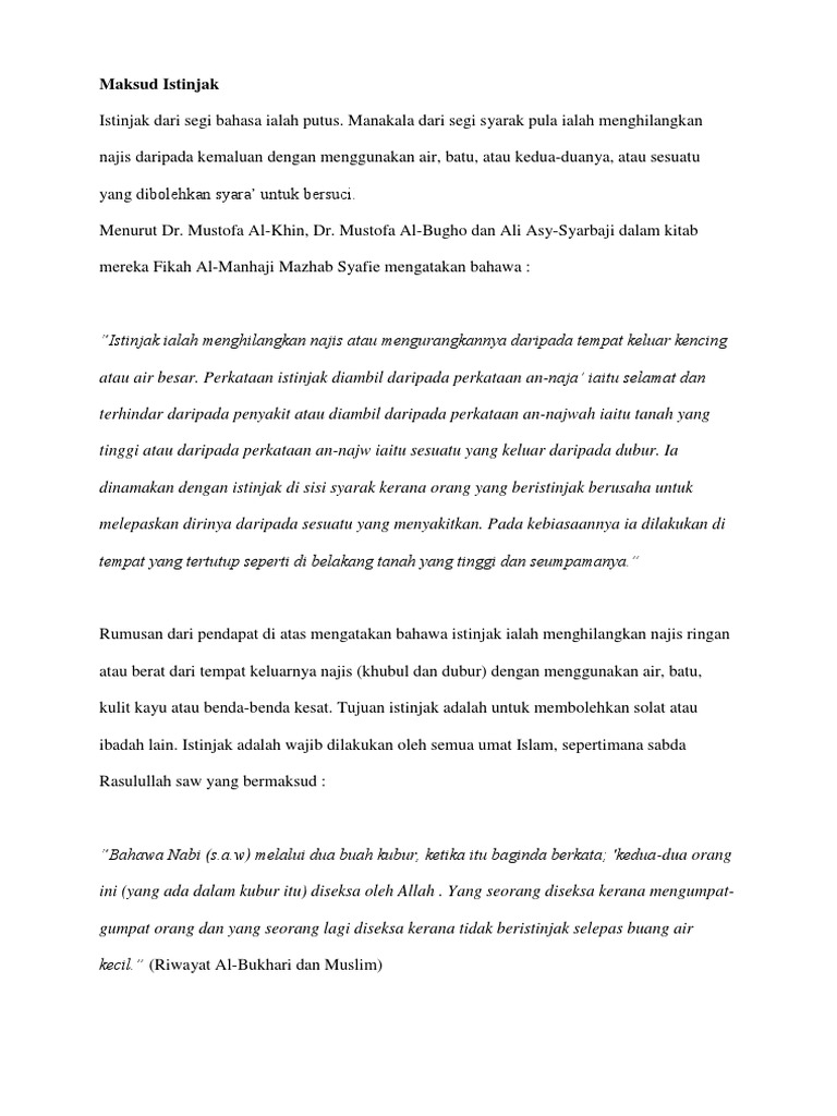 Jika diulang-ulang di tempat yang sama dengan satu batu maka wajib beristinjak dengan menggunakan air. Memadai beristinjak dengan menggunakan air atau tiga biji batu atau sebiji batu yang mempunyai tiga penjuru pada tempat-tempat istinjak melainkan kesan-kesan yang tertinggal yang tidak dapat dihilangkannya kecuali dengan air. Ii Menggunakan Air Mutlak Basuh tempat keluar najis dengan air mutlak sehingga bersih iaitu hilang bau warna.